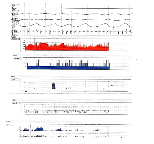 事件趨勢圖:下頜肌電、腿動、鼾聲、微覺醒、周期性呼吸、心率、血氧飽合度等趨勢圖。